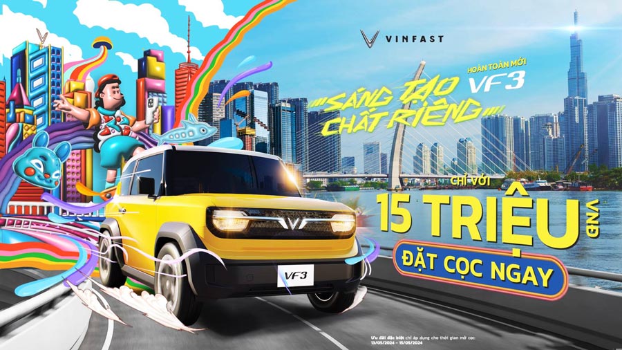 Theo thông báo, từ ngày 13/5 đến 15/5/2024, khách hàng có thể đặt mua VF 3 với giá ưu đãi và những tính năng đáng chú ý như thời gian sạc pin nhanh, nội thất rộng rãi, và khả năng di chuyển linh hoạt trong đô thị. Mẫu xe này cũng có sẵn trong 9 màu ngoại thất để phù hợp với cá tính của từng chủ nhân.